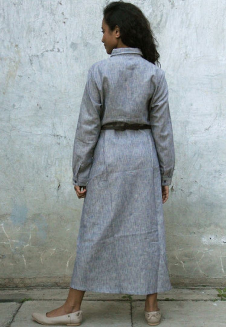 Triset Gaun midi dengan cuttingan A-line, motif abstrak titik kecil, lengan panjang, model kerah kemeja, sudah termasul belt, detail material katun.