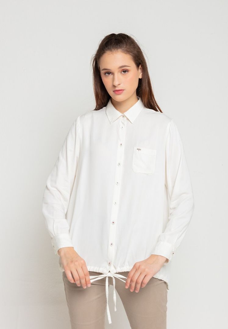 Elle Blouse Adalah Blouse Berlengan Panjang Dengan Detail Kerah Mandarin Dan Front Drawstring Dari Triset.