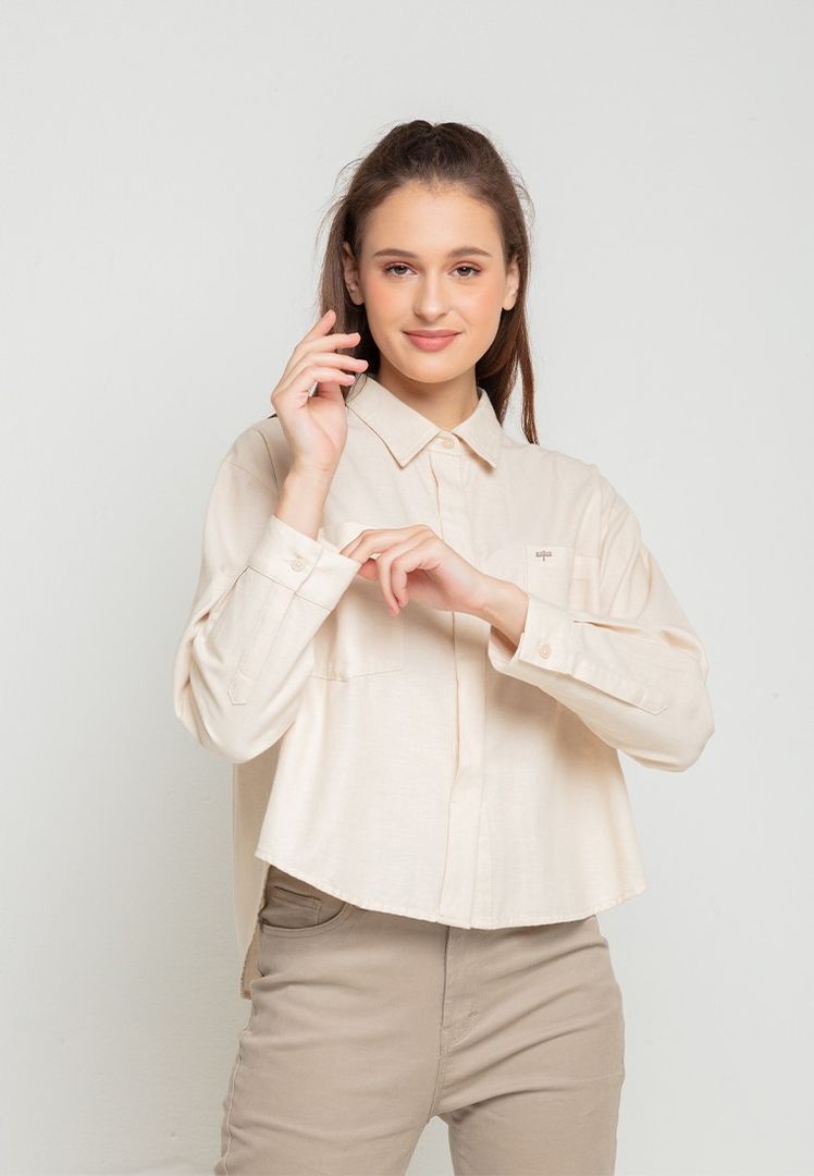 Triset Blouse oversize crop dengan cuttingan ovale pada bagian bottom, lengan panjang dapat di gulung, model kerah kemeja, full menggunakan plaket, detail material katun.
