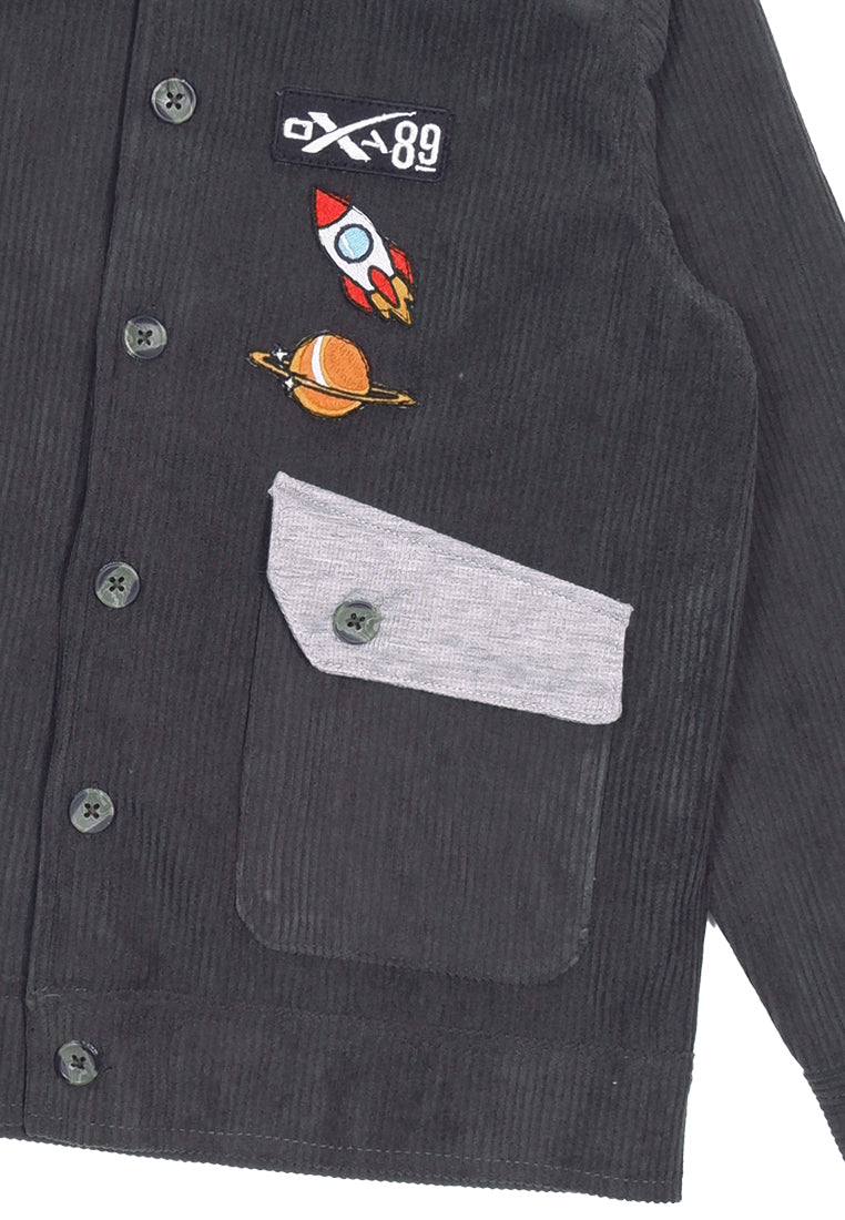 OXA Kids jacket parka dilengkapi hood, cuttingan reguler fit, bahan corduroy, full menggunakan kancing, sepasang saku tempel di bagian depan, di lengkapi 3 emblem, detail material 100% Polyester.