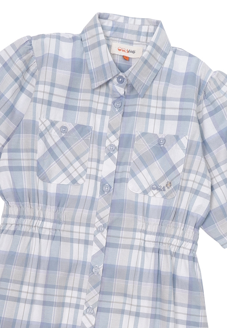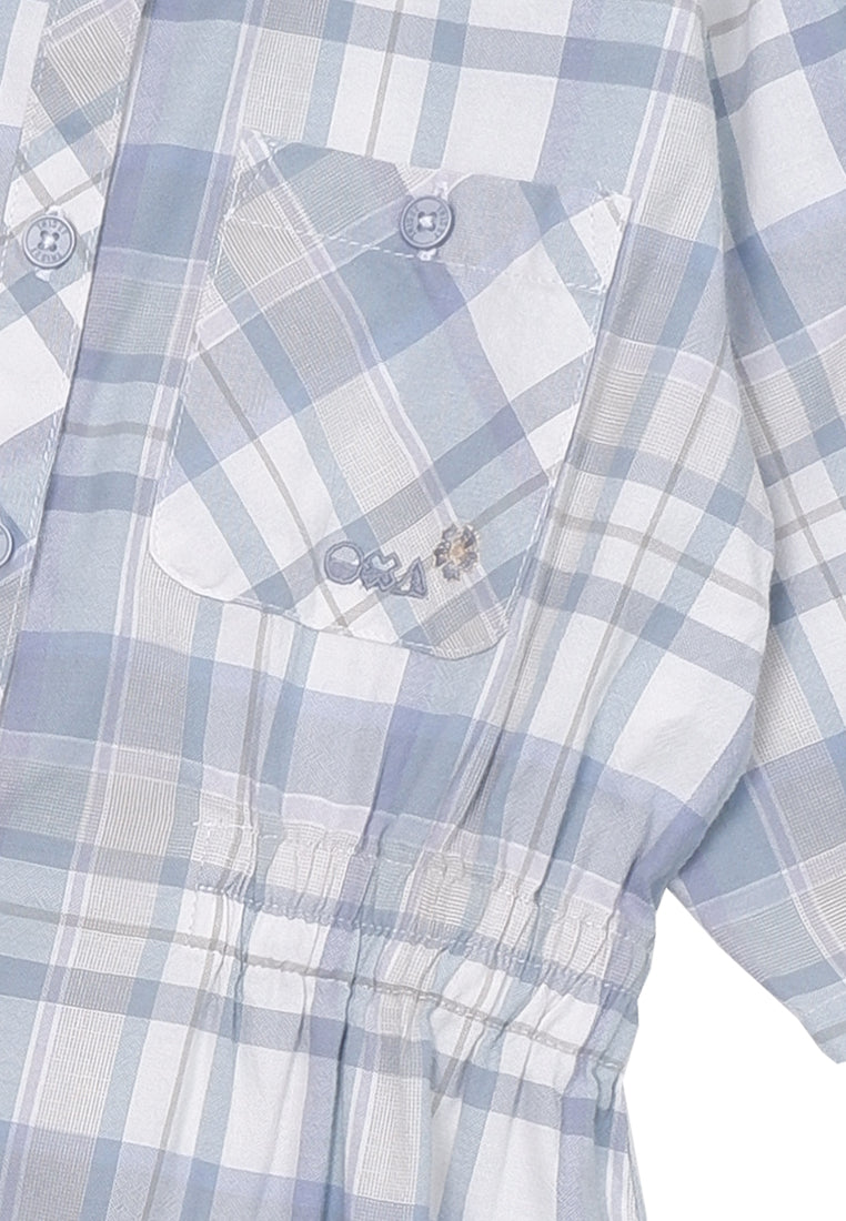 OXA Kids dress dengan cuttingan A-line, lengan pendek, motif kotak – kotak, shirt collar, sepasang saku tempel di bagian depan, pada bagian pinggang menggunakan rubber, full menggunakan kancing, bagian pundak mengkerut, detail materiak 100% Cotton.