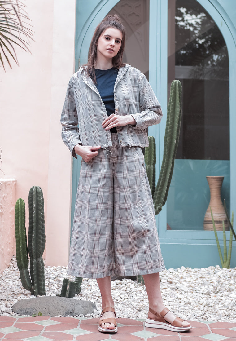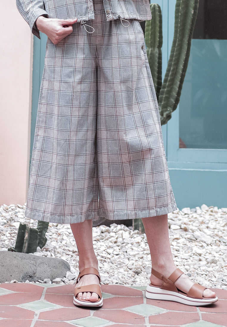 Triset cullote pants dengan cuttingan flare, bagian pinggang full menggunakan rubber, panjang 7/8, sepasang saku di bagian samping, motif kotak - kotak, detail material cotton.