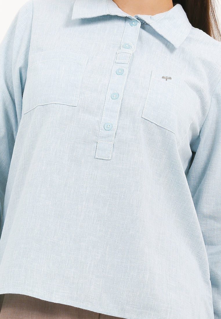 Triset blouse dengan cuttingan asimetris, model kerah kemeja, menggunakan ½ plaket, sepasang saku di bagian depan, di lengkapi variasi kancing mati di bagian belakang, detail material katun.