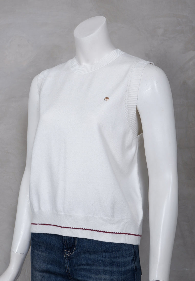 Triset Vest Knit dengan cuttingan reguler fit, detail menggunakan ribs, terdapat pin TRISET, crewneck, variasi warna di bagian ribs bottom, detail material 100% Rayon.