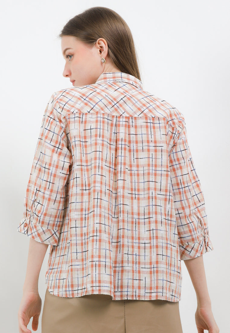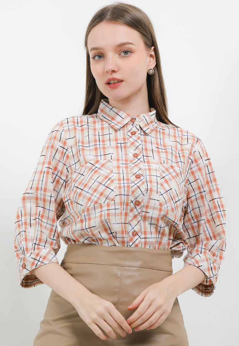 Triset Blouse reguler fit, motif kotak - kotak, model kerah kemeja, panjang lengan 7/8, bahan bertekstur timbul, detail material katun polyester.
