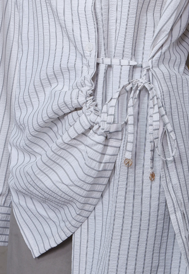 Triset Blouse dengan cuttingan loose, two in one stails, di bagian depan terdapat tali serut di lengkapi gantung pin triset yang bisa di adjust, motif striped, shirt collar, lengan panjang detail ribs, full menggunakan plaket, detail material 85% Polyester & 35% Cotton.