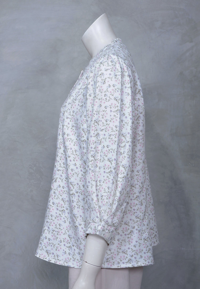 Triset Blouse oversize dengan cuttingan loose, panjang lengan 7/8 detail manset, full menggunakan double plaket, motif floral, ruffle collar, variasi sambungan, detail material 55% Rayon & 45% Cotton.