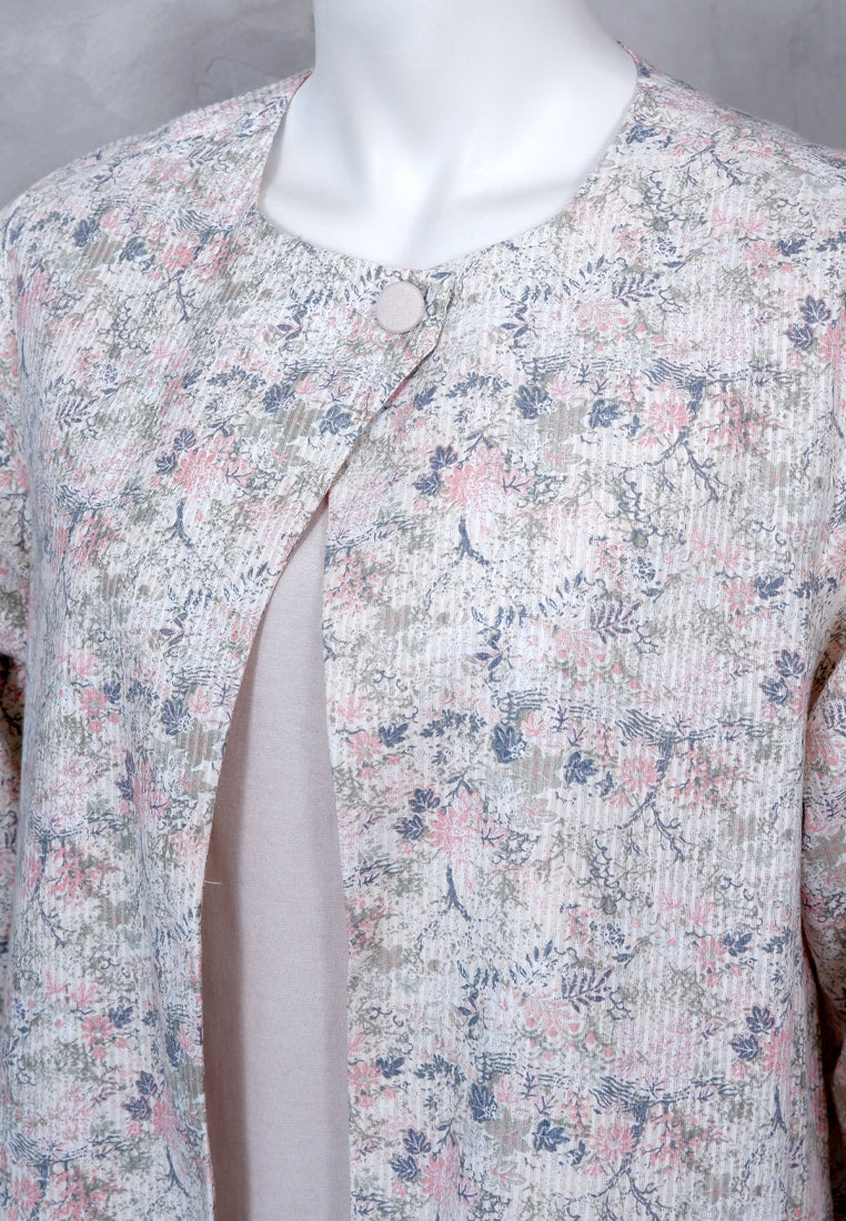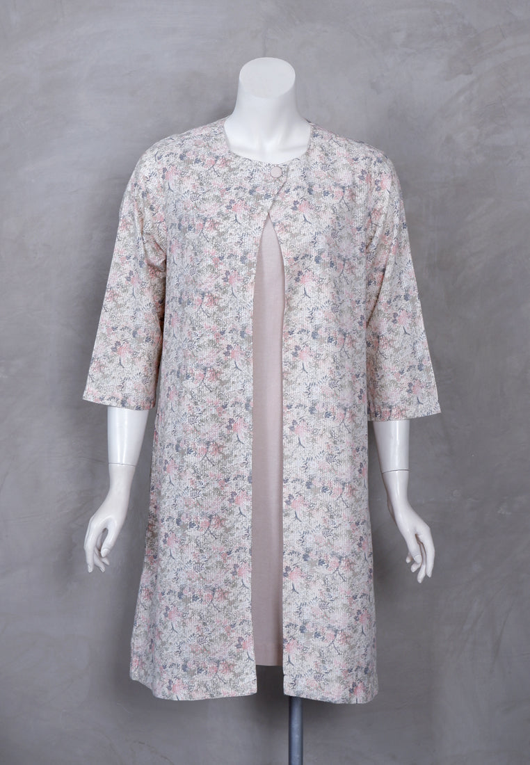 Mini dress/tunik dengan cuttingan loose, motif bagian luar floral dan bagian dalam polos, inner menyatu dengan bagian dalam, panjang lengan 7/8, detail material 100% katun.