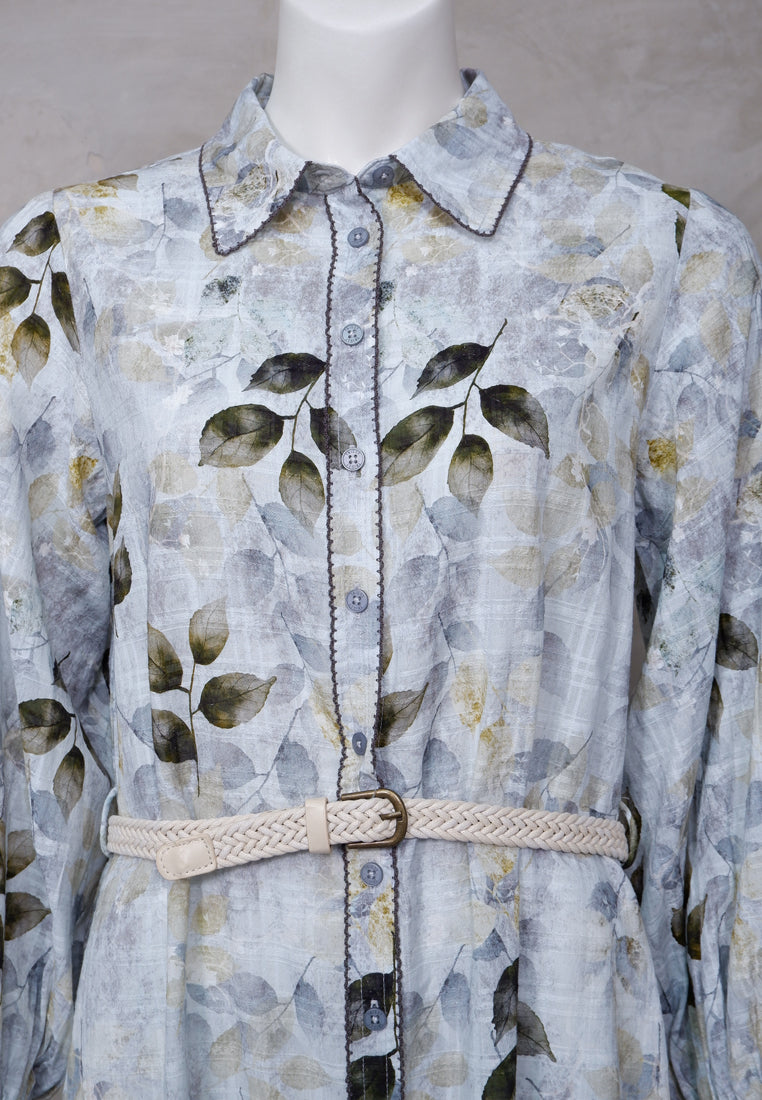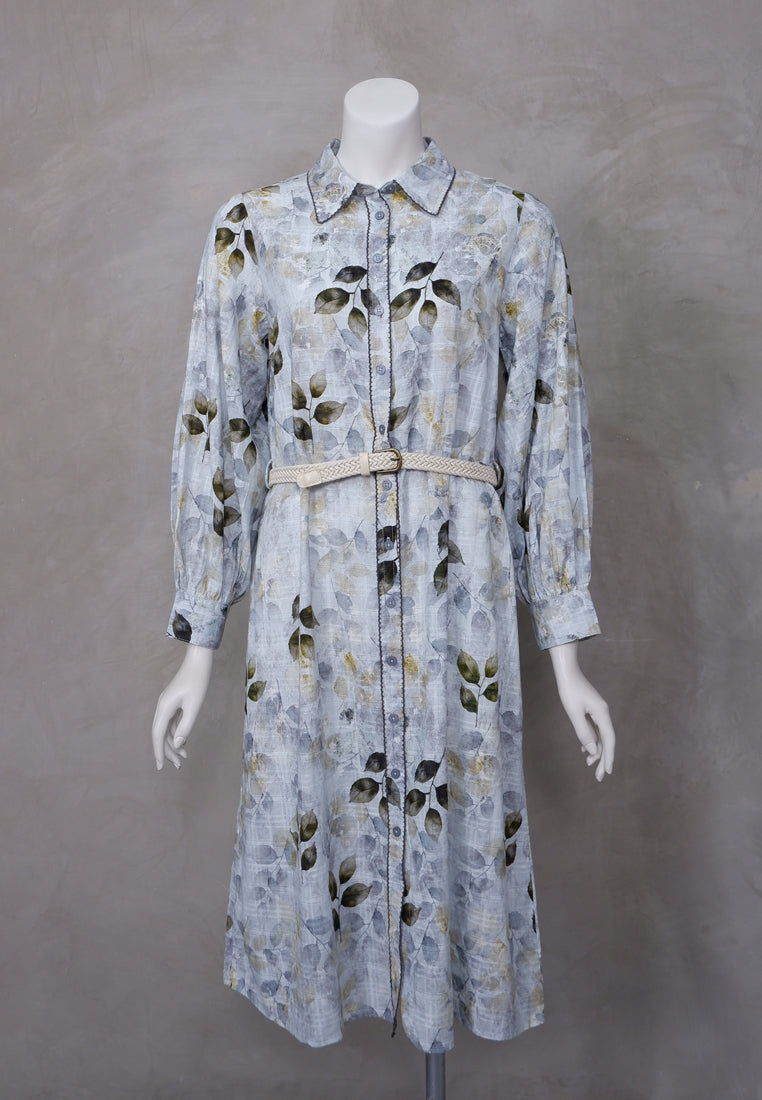 Triset midi dress dengan cuttingan A-line, full menggunakan plaket di lengkapi dengan renda kecil, shirt collar, motif floral, lengan panjang detail ribs, bahan bertekstur, sudah free belt, detail material 100% Cotton.