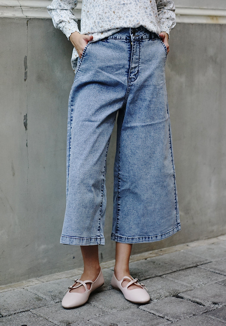 Triset Denim Pants cullotes dengan cuttingan loose, warna full wash, pada bagian pinggang manggunakan double tab, panjang 7/8, bahan streach, detail material 75% katun, 23% polyester & 2% spandeks.